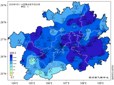 貴州省2020年9月以來降水量及其距平百分率(央廣網發 貴州省氣候中心供圖)