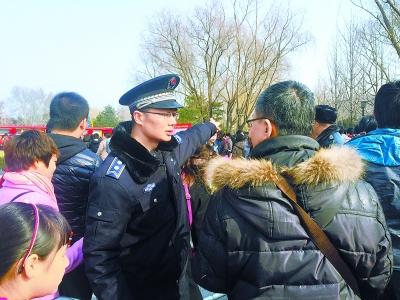 楊懷廣在地壇廟會南門外的臨時售票處前維持秩序。