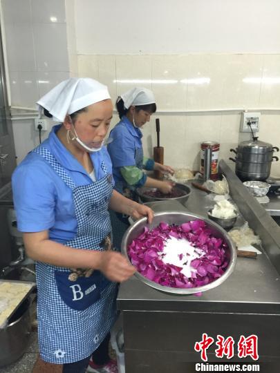圖為云大食堂工作人員用玫瑰園的花瓣制作鮮花餅 陳靜 攝