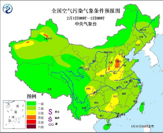 1月31日08時至2月1日08時,華北中南部、黃淮西北部、陜西關中等地空氣污染氣象條件為3級,部分地區4級。華北中北部等地不適宜燃放煙花爆竹。全國其余大部地區空氣污染氣象條件較好,有利于污染物的擴散。