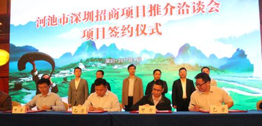 央廣網深圳4月28日消息(記者于揚)4月27日,河池市深圳招商項目推介洽談會在深圳市舉行。當天,河池市與投資商成功簽約項目27個,計劃總投資151.3億元,項目涉及健康養生、生態旅游、基礎設施、新能源、商貿物流等領域,投資商來自香港、廣東深圳等地。