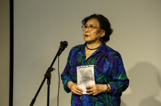 在互動環節中,管宗祥先生的夫人、著名表演藝術家于黛琴帶領的北影社區老年朗誦隊進行了精彩的朗誦表演。這支由退休老人組成的朗誦隊,在于老師的辛勤指導下,成為了一支經常活躍在社區和各種公益活動的出色的朗誦團體。此后,于老師一首聲情并茂、感人至深的詩朗誦,得到觀眾熱烈的掌聲。