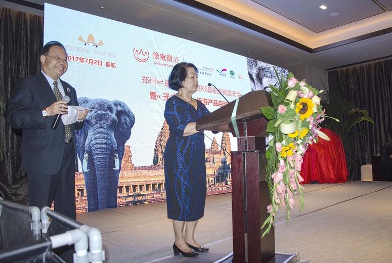 柬埔寨王國駐華大使館KHEK/MCAIMEALY女士、河南旅游局副局長周耀霞女士應邀出席并作了熱情洋溢的講話。出席本次發布會的還有鄭州市旅游局副局長李明偉、柬埔寨K6吳哥航空公司商務代表黎嘉嘉、北京美嘉環球國際旅行社有限責任公司董事長周旭東以及河南省各知名旅行社負責人。