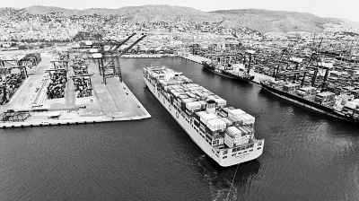 中遠海運的貨船駛出中國和希臘合力打造的比雷埃夫斯港集裝箱碼頭。新華社發