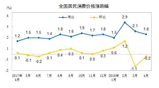 人民網北京5月10日電(楊曦)國家統計局今日公布數據顯示,2018年4月份,全國居民消費價格(CPI)環比下降0.2%,同比上漲1.8%。國家統計局城市司高級統計師繩國慶表示,食品價格下降是CPI環比下降的主要因素。
