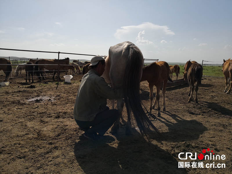 呼格吉勒圖家的養馬場,工人正在擠馬奶。攝影:黎萌