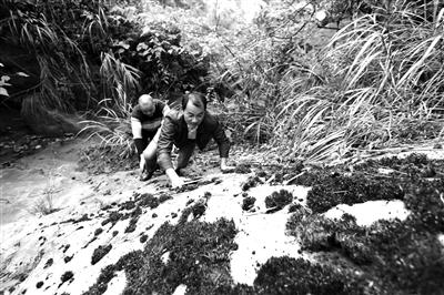 圖為向文川與駐村工作組隊員一起攀爬10余米高的石壁去檢查引流水管。