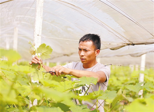 5月2日,江西省吉水縣醪橋鎮西坑村生態家庭農場,劉國富在葡萄園剪枝。劉國富從北京返鄉創辦了國富生態家庭農場,帶領當地百姓脫貧致富。 廖 敏攝(中經視覺)