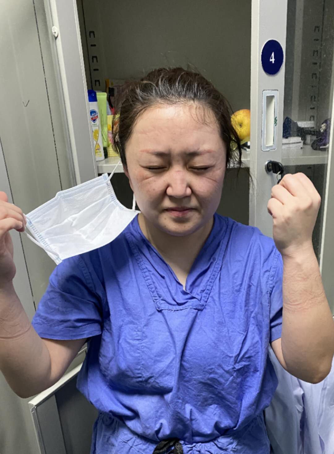 防護服、N95口罩、護目鏡、面屏,全副武裝,外面密不透風,里面是滿滿的水汽。口罩帽子勒得耳朵疼,護目鏡壓得鼻梁和臉疼,兄弟姐妹對這些早已習慣,對病房環境的恐懼也逐漸消弭。面對患者,我們準確無誤完成操作,快而不亂,緊張而有序。面對這樣的我們,患者的心情也逐漸放松,堅定著戰勝疾病的信心。