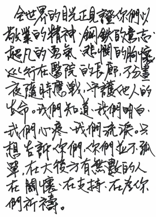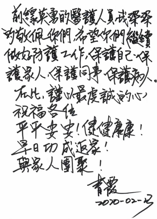 3月初,華中科技大學同濟醫學院附屬同濟醫院收到了一份捐助,共計2000副醫用手套,還有一封用繁體字書寫的信,署名是青霞。