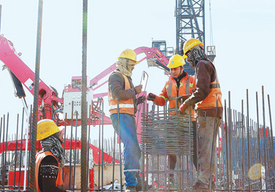 圖為埃及新首都中央商務區“標志塔”工程施工現場,中埃兩國項目員工共同綁扎鋼筋。