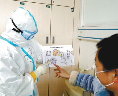 為緩解患者的焦慮情緒,在武漢大學中南醫院隔離病房,河北醫療隊護士用漫畫同患者交流。