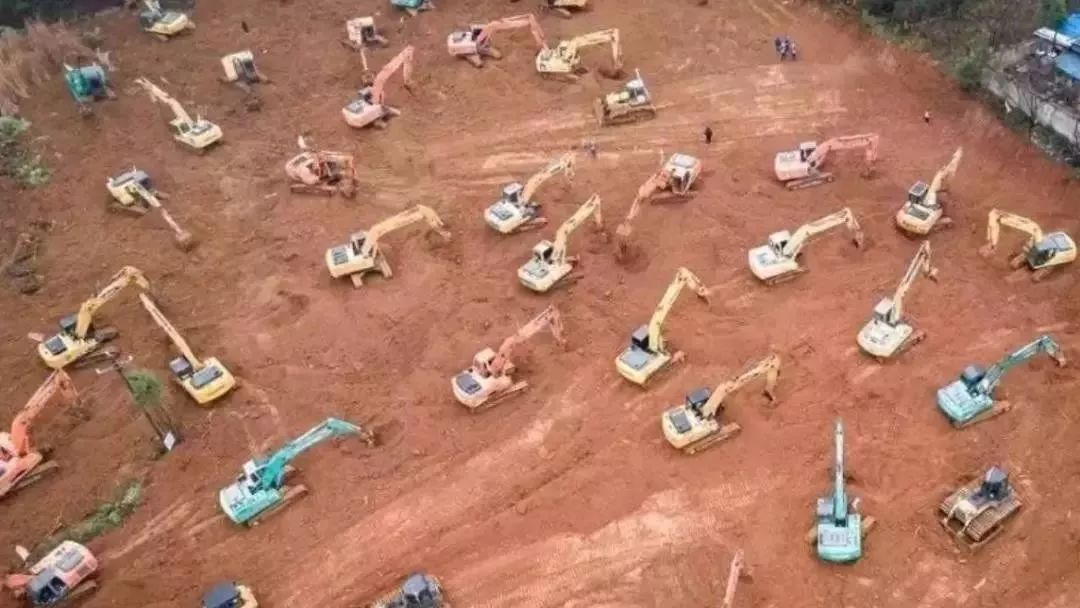 1月24日除夕 第1天 上百臺挖機抵達火神山醫院現場,開始土地平整