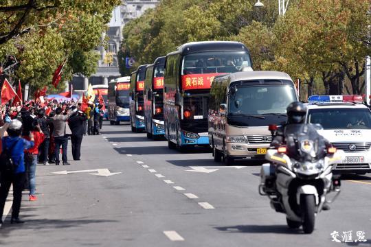 交匯點訊 2月11日晚,江蘇援黃石醫療隊踏著夜色風雨而來;3月20日,東楚回春、磁湖水綠、櫻花復妍,黃石疫情蔓延擴散的勢頭得到全面遏制,江蘇醫療隊第一批隊員帶著春光暖陽而歸。像當時迎接一樣,當天上午,黃石各界以最高禮遇十里相送240位江蘇“白衣戰士”返程。