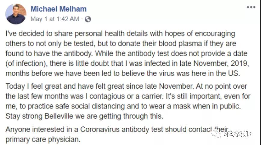 此前,美國新澤西州貝爾維爾市市長邁克爾·梅爾哈姆5月1日在其社交媒體上發文稱,他認為自己去年11月生病就是因為感染了新冠病毒。他說,當時醫生診斷他得了流感,可后來新冠病毒抗體檢測結果卻呈陽性。梅爾哈姆說,他身邊的很多人曾在去年11月、12月生病且癥狀嚴重。