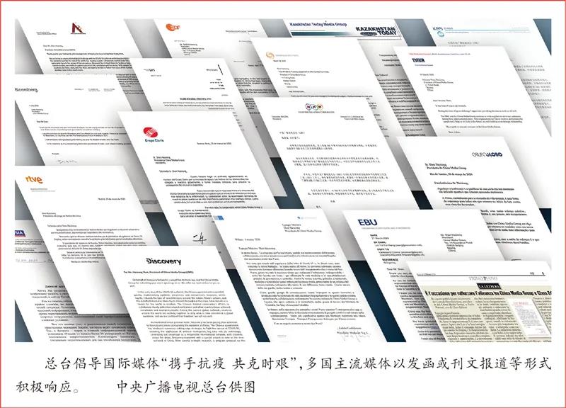 攜手抗疫、共克時艱,向國際同行發出中國媒體最強音。疫情發生后,習近平總書記與各國元首、各國際組織負責人等頻密溝通、深化共識,以務實高效的方式有力推動國際合作。我們緊緊跟隨習近平總書記外交步伐,積極探索創新媒體公共外交方式方法,以文會友、主動作為,投桃報李、廣結善緣。1月底至3月初,總臺先后收到104家國際主流媒體和全球5家主要媒體組織負責人的慰問信,總臺負責人逐一復函致謝,并倡導國際媒體同行及時、客觀、全面地報道中國的疫情形勢及中國抗疫的巨大努力和積極成效。隨著疫情在境外擴散蔓延,3月上旬至6月底,總臺向112家國際媒體機構負責人和32個國家駐華大使發去慰問函,介紹中國政府積極開展抗疫國際合作的立場和行動,呼吁國際媒體加強合作、同向發力,為戰勝疫情做出負責任媒體應有的努力和貢獻。路透社、法新社、全俄廣播電視公司、英國廣播公司、韓國放送公社、日本廣播協會等媒體同行紛紛以發函或刊文報道等形式積極回應,肯定中國在抗擊疫情中的國際合作和大國擔當,贊賞總臺作為國際主流媒體的責任和作用,并表示愿意以此為契機與總臺加強包括抗疫報道在內的多領域合作。