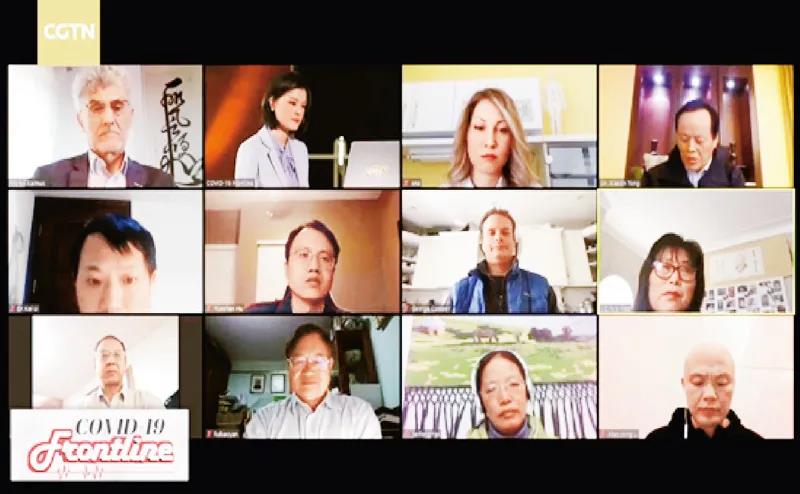 △總臺節目《全球疫情會診室》通過視頻連線向各國專家介紹中國一線醫護人員抗疫寶貴經驗。(中央廣播電視總臺 供圖)