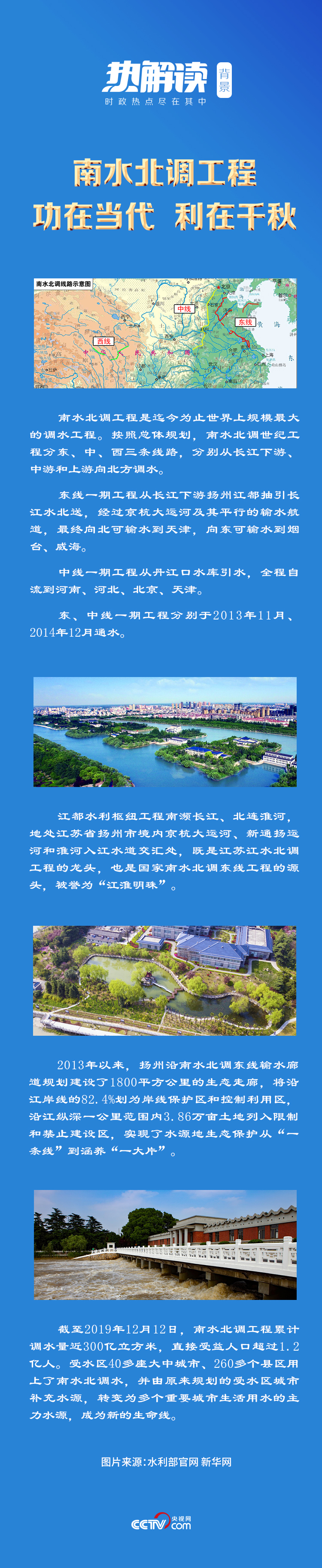 2019年12月,南水北調東、中線一期工程迎來全面通水5周年。在以習近平同志為核心的黨中央領導關懷下,南水北調工程5年累計調水量近300億立方米,直接受益人口超過1.2億人。