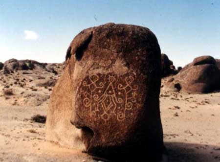 生育神圖在內蒙古阿拉善盟阿拉善右旗蘇海德,巖畫生育神鑿刻在一塊孤立的巖石上,是以三個圖案化的人形來表示。居中者為女神,頭頂有一半圓形光圈,生殖器官顯露;兩邊則各為一個男神。