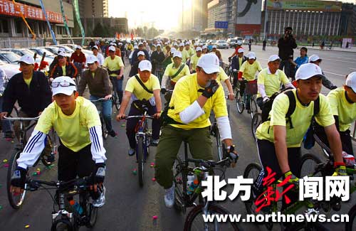 5月1日6時許,來到自行車首府一日游的集合地新華廣場時,報名參加自行車首府一日游的500名隊員已經到場。身穿紅、黃、藍、綠、黑奧運五環顏色T恤的隊員個個精神抖擻。做完熱身運動,檢查了一遍車輛后,隊員們根據所穿衣服的顏色組成隊列,等候出發的命令。隨著一聲令下,隊員爭先恐后地出發了。