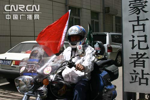 中廣網呼和浩特5月28日消息(記者鄭穎 實習記者張璐)62歲的東北漢子趙振寬,以他驚人的毅力和濃厚的民族情結,在整整一年的時間里騎摩托車踏遍了祖國的各個省市,全力宣傳。一路上,他不收媒體和政府的一分贊助,為的就是不讓自己的行為和動機變質。在最艱難的時候,他只能吃野草、喝泥水、風餐露宿,但從不抱怨。