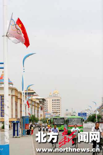 中廣網呼和浩特6月19日消息 記者近日在呼和浩特市的一些街道上看到,道路兩旁掛起了五星紅旗和奧運會會徽、會旗,為即將在內蒙古進行的奧運圣火傳遞活動營造出莊嚴喜慶的氛圍。(孫慧)