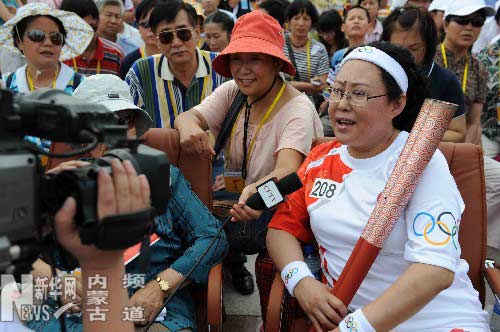 7月10日,最后一棒火炬手斯琴高娃(右)接受記者采訪。當日,北京奧運圣火在內蒙古自治區赤峰市傳遞。 新華社記者張領攝