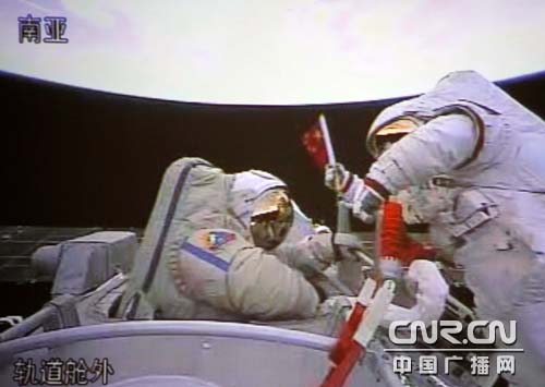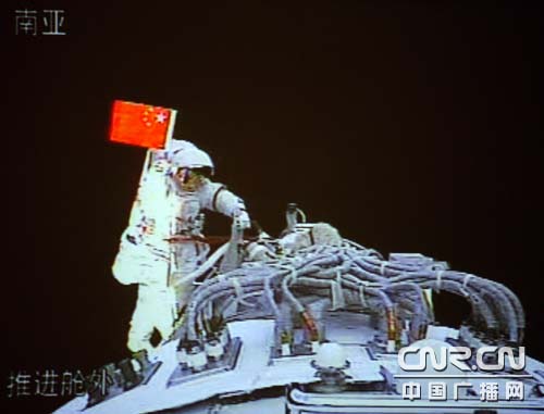 航天員翟志剛揮動著五星紅旗漂浮在太空。(中廣網記者南光 曹囡囡攝)