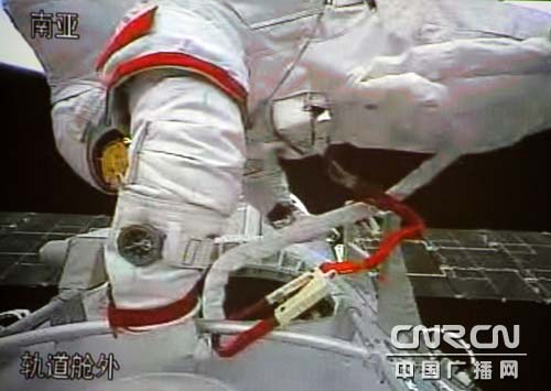 艙外航天員身上的安全掛鉤將航天員與神七飛船緊密相連。(中廣網記者南光 曹囡囡攝)