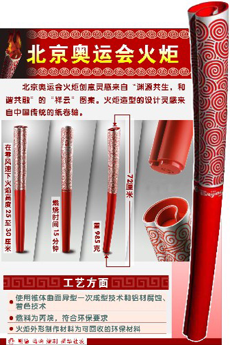北京奧運會火炬長72厘米,重985克,燃燒時間超過15分鐘,能在每小時65公里的強風和每小時50毫米雨量的情況下保持燃燒;鹧娓叨25至30厘米,在強光和日光情況下均可識別和拍攝。整個火炬高雅華麗,內涵厚重,帶有濃郁的中國特色,和諧地將中國文化與奧林匹克精神結合在一起。其所蘊含的“淵源共生,和諧共融”理念充分是對奧林匹克精神和奧林匹克圣火內涵的一次獨特詮釋。祥云、漆紅、紙卷軸等中國元素的融入,使得古老的東方文明和現代的奧林匹克精神再一次完美結合,迸發出耀眼的火花。