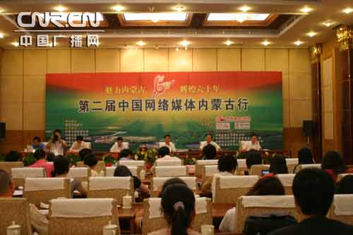 中廣網呼和浩特7月15日消息 (記者文偉 實習記者王巖) 在喜迎內蒙古自治區成立六十周年之際,內蒙古迎來了來自全國50多家網絡媒體的記者和編輯。他們將從15日起程,途經內蒙古14個盟市,以“魅力內蒙古輝煌60年”為主題,對內蒙古的工業、農業、文化、旅游業等方面的發展和成就進行采訪報道。這是記者7月15日從第二屆中國網絡媒體內蒙古行新聞發布會上了解到的情況。