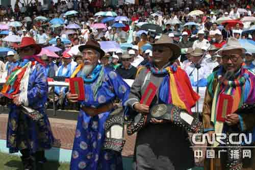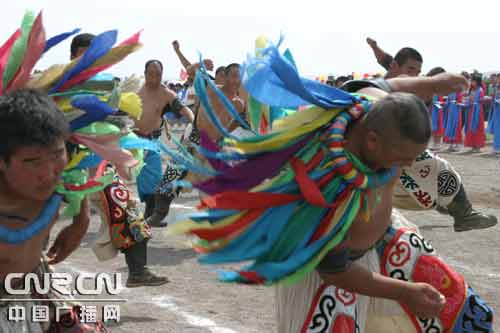 一年一度的蒙古族那達慕大會吸引了許多外地和國外游客,一位意大利游客馬可興奮地說:“我非常喜歡大草原和蒙古族文化。我特意邀了20名好友一起從意大利來到這里看那達慕。”在25日上午的那達慕開幕式上,精彩的蒙古族歌舞表演和馬術表演迎來了觀眾們的陣陣歡呼。 本屆那達慕大會由內蒙古自治區旅游局、烏蘭察布市人民政府共同主辦,四子王旗人民政府、烏蘭察布市旅游局、四子王旗格根塔拉草原旅游中心承辦。那達慕將從7月25日開始持續到31日。烏蘭察布市旅游局局長劉廣平告訴記者:“今年的那達慕大會恰逢內蒙古成立60 周年,主辦方整合各種資源,擴大了規模,增加了傳統項目賽馬、摔跤、射箭的參加馬匹數和參賽人數,同時將傳統的祭敖包活動也編進了那達慕大會。在表演方面,邀請了內蒙古馬術隊、蒙古國東戈壁省歌舞團、蒙古國人體彩繪等知名表演隊前來表演。大會還進一步改善旅游接待設施,新建了蒙古戰車包50頂,改建了接待包和千人大餐廳,擴建了草原噴灌設施! 那達慕,蒙古語意為游戲或娛樂的意思,是蒙古族人民在漫長的歷史活動中凝練和創造并延續下來的不限場地、草原牧民能全員參加的節慶活動。它集競技、交流、歡慶為一體,文藝表演、賽馬、摔跤、射箭是其重要內容。如今,內蒙古自治區旅游那達慕已經在格根塔拉草原旅游中心成功舉辦了十七屆,成為內蒙古草原旅游的知名品牌,每年吸引著來自海內外的大量游客。