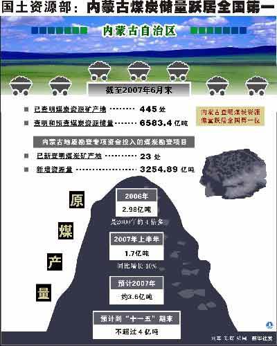 內蒙古自治區是中國煤炭資源儲量最大的省區,據國土資源部剛剛公布的消息說,內蒙古自治區已經查明和預查煤炭資源儲量達到6583.4億噸,超過山西省,居全國第一位。