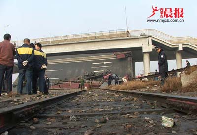 記者從包頭市委宣傳部獲悉:23日晚23時許,三輛拉運鋼板的奔馳半掛牽引重型貨車和一輛轎車由南向北行駛至包頭市民族東路高架橋上時,橋面突然發生傾斜,導致兩輛載重汽車和一輛轎車隨路面傾斜滑到橋底,造成橋下鐵路專用線中斷。