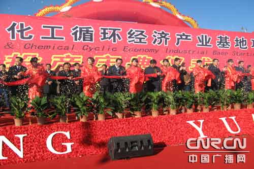 億利能源化工循環經濟產業基地是億利資源集團與我國最大的煤炭企業——神華集團、全國化工行業領軍企業上海華誼集團、全國水泥行業排頭兵唐山冀東水泥公司聯手打造的我國西部地區大型能源化工循環經濟產業基地。這次投產的投資130億元的一期工程,從2005年4月開工建設,主要包括1000萬噸煤炭開采、4臺20萬千瓦煤矸石自備電廠、40萬噸聚氯乙烯、40萬噸離子膜燒堿、120萬噸工業廢渣制水泥等五大項目,形成了“煤——煤矸石發電——精制鹽——離子膜燒堿——PVC——工業廢渣制水泥”一體化的循環經濟產業鏈。