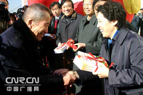 內蒙古黨委宣傳部部長烏蘭向群眾贈送十七大圖書(馬立峰 攝)