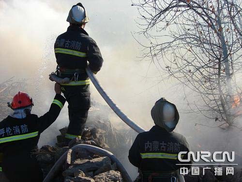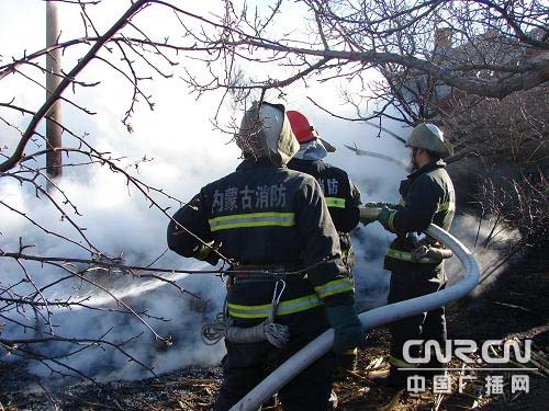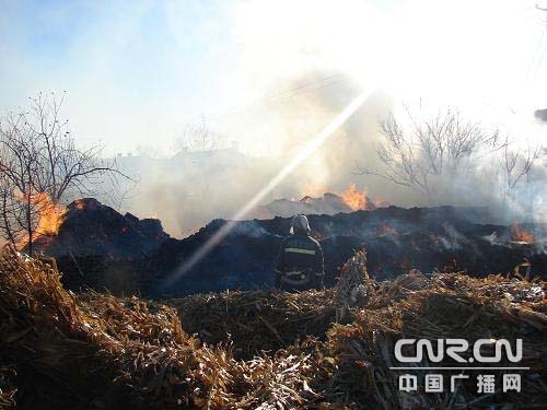 中廣網呼和浩特11月26日消息 (記者阿都欽 通訊員王保國)11月26日上午,內蒙古阿榮旗那吉屯農場水庫隊五馬架村2家草垛連著起火,危及周圍數戶民房和草垛,消防官兵快速出動排除險情。