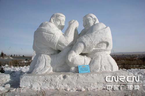 雪雕:掰手腕 中廣網呼和浩特2月3日消息 (記者阿都欽)入冬之后,內蒙古東烏珠穆沁旗所在地烏里雅斯太鎮的庫倫廟廣場成為城鎮居民、牧民群眾喜愛的休閑場所。這里具有濃厚民族風情的雪雕展將這座嚴冬中的邊陲小鎮裝扮的更加靚麗。