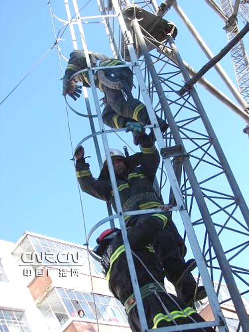 9時16分,大隊9名官兵趕到現(xiàn)場。到場后官兵們看到125米高的微波塔第一平臺上正站著一個人,他一只手扶在鐵架上,四處張望,并隨時都有跳塔的可能,情況十分危險。 通過網(wǎng)通公司值班室人員現(xiàn)場了解,得知塔上是名男性,年齡約60歲左右。當他在爬到半空中時,被公司值班室人員發(fā)現(xiàn),但他不顧值班人員勸阻,執(zhí)意爬上了微波塔。