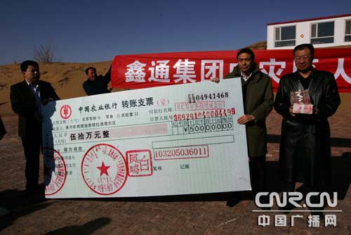 中國紅十字總會已從西安備災中心緊急調(diào)撥價值25萬元的50頂棉帳篷送到了災區(qū),中國氣象局及鄂爾多斯市有關(guān)旗縣氣象局共同送來價值6萬元的棉被、衣物、炊具、食品等物資。內(nèi)蒙古億利資源集團、杭錦旗康泰集團公司共向災區(qū)捐助了價值40萬元的食品、飲用水和藥品,神華杭錦能源有限公司捐助現(xiàn)金20萬元,鄂爾多斯市市直教育系統(tǒng)捐助33萬元現(xiàn)金、價值4萬元左右的學生學習用品、衣被等。