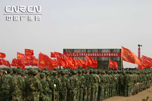 中廣網呼和浩特4月26日消息(記者文偉 內蒙古臺杜少俊 烏蘭察布臺護群)北京軍區、內蒙古軍區京津風沙源治理商都義務植樹誓師動員大會26日上午在商都縣七臺鎮舉行。誓師動員大會現場,彩旗飄揚。北京軍區、內蒙古軍區6000名官兵和商都縣干部職工、民兵、預備役、學生共1萬多人參加誓師動員大會。