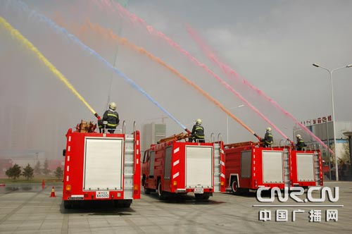 演練結(jié)束后,顏炳強(qiáng)局長在有關(guān)領(lǐng)導(dǎo)的陪同下,參觀了廣場四周展示的各種先進(jìn)消防裝備,親切慰問了消防官兵,并認(rèn)真聽取了他們對所操作裝備的講解。展示的裝備包括通信指揮車、消防水罐車、高噴消防車、云梯消防車、高架平臺(tái)消防車、設(shè)備檢修車、伙食保障車,以及新裝備的消防坦克。