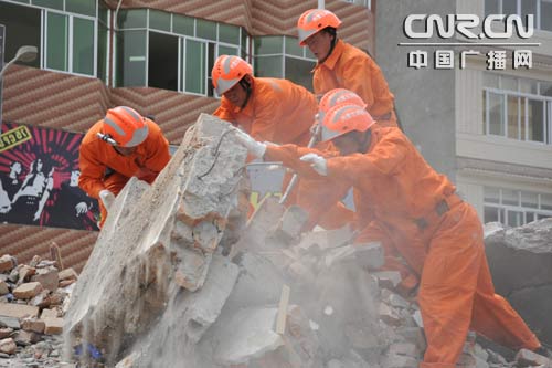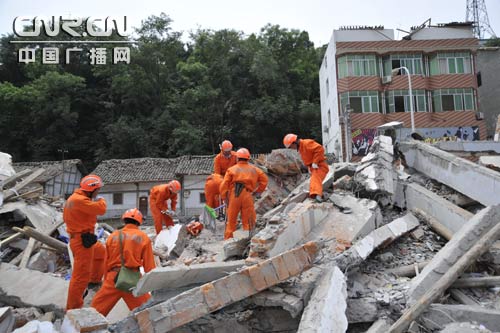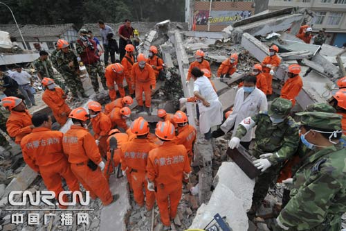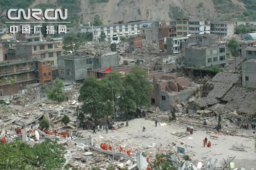 5月16日中午,內蒙古消防赴川抗震搶險救援隊救援工作調整到鎮內兩條街道上的居民區,救援隊分成35個小組,重點對居民住宅和確認有人埋壓的區域進行搜救。