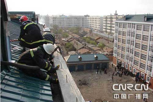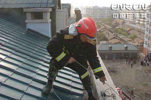 指揮員馬上聯系知情人員,上到頂樓的天窗部位觀察火勢,此時天窗已經被上面的火焰給封住了,人員無法由天窗進入救助。指揮員迅速將人員分為兩組,采取內外夾攻的戰術進行撲救,一組由天窗下方用水槍對悶頂的火勢由下而上進行掃射,澆滅天窗外圍的火勢后,上到悶頂進行撲救。一組由外側的外掛樓梯上到頂層進行撲救。由于樓層較高,消防官兵用安全繩將水帶、破拆用的工具等物品拉到上面。