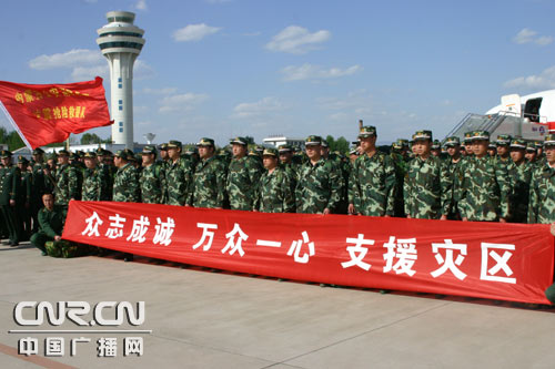 我們150名官兵,懷著內蒙古2800萬人民和總隊3500名官兵的深情囑托,帶著不奪全勝、不完成任務誓死不回頭的決心和只要一息尚存就不退出陣地的信心,踏上了赴川抗震救援的征途,從登上飛機的那一刻起,我們的戰(zhàn)士一直斗志高昂,心情迫切,恨不得立即趕到災區(qū),幫助災區(qū)人民渡過難關。我們很多戰(zhàn)士都是第一次坐飛機,那些平素里美麗端莊優(yōu)雅得近乎高傲的空姐,在飛機上不停地與我們這些老實得近乎傻氣的戰(zhàn)士打招呼、合影,這些常年在水里火里打拼的戰(zhàn)士,平時只知道攀墻躍架,哪見過這陣勢,略顯靦腆。我想,別說這些展示了,即便是我們,在平時也根本沒有機會與空姐合影,是因為我們毅然奔赴抗震救援一線的行動,才得到了那么多人的尊敬。只有英雄才會與美麗結緣。