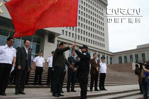 自治區(qū)副主席連輯為救援隊(duì)授旗 內(nèi)蒙古自治區(qū)副主席任亞平:“同志們,內(nèi)蒙古自治區(qū)呼市公安局第二批赴四川災(zāi)區(qū)抗震救災(zāi)突擊隊(duì)現(xiàn)在出發(fā)!