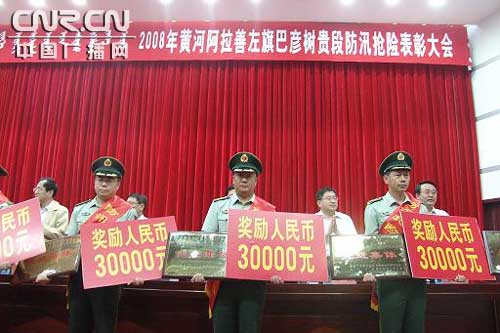 中廣網呼和浩特6月3日消息(記者鄭穎 通訊員張攀峰、吳志強)5月30日,2008年黃河內蒙古阿拉善左旗巴彥樹貴段防汛搶險表彰大會在阿拉善盟黨政大樓隆重召開,阿盟邊防支隊被表彰為“2008年黃河阿拉善左旗巴彥樹貴段防汛搶險先進集體”,獎勵人民幣30000元,支隊吳永健等5名官兵被評為先進個人,支隊全體參戰的38名官兵同時獲得盟委行署頒發的榮譽證書。