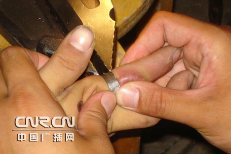 消防官兵經(jīng)過仔細(xì)觀察,決定使用鋼鋸條慢慢將戒指鋸斷取下,為避免給傷者帶來二次傷害,消防官兵首先用兩枚鋼釘插入小伙子手指與戒指中間,由兩名消防員把牢受害者的手指和鋼釘后,用鋼鋸慢慢鋸戒指,并邊鋸邊用水散熱,經(jīng)過消防官兵近半個(gè)小時(shí)的努力,戒指才被鋼鋸拉開了一個(gè)口子,隨后,消防官兵又用兩個(gè)尖嘴鉗將戒指剩余的連接部位輕輕撬開,終于將卡在小伙子手指上的戒指成功取下。
