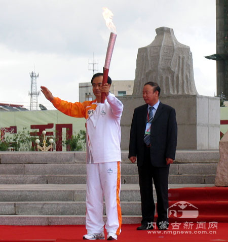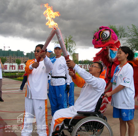 上午9點45分,北京奧組委執行副主席蔣效愚高擎殘奧會火炬,交給內蒙古自治區黨委常委、政法委書記刑云,再轉交北京殘奧會火炬傳遞呼和浩特站第一棒火炬手內蒙古自治區殘疾人聯合會理事長楊志民。2008北京殘奧會火炬傳遞“中華文明線”第二站就此拉開帷幕。