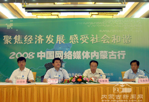 | 中廣網呼和浩特9月4日消息 2008年9月3日,由國務院新聞辦網絡局指導,內蒙古自治區黨委宣傳部、自治區黨委外宣辦、自治區經濟委員會、自治區旅游局主辦,內蒙古互聯網新聞中心、呼和浩特市市委宣傳部、鄂爾多斯市市委宣傳部、烏海市市委宣傳部承辦的“聚焦經濟發展感受社會和諧”第三屆中國網絡媒體內蒙古行大型宣傳采訪活動在呼和浩特正式啟動,來自全國各地的近40家網絡媒體編輯記者齊聚首府,將對內蒙古進行全面報道,采訪團成員將深入呼和浩特市、鄂爾多斯市、烏海市,對三市的三大產業進行深入采訪,著重報道改革開發30年來內蒙古經濟社會各領域取得的累累碩果,感受改革開放30年來內蒙古經濟快速發展給內蒙古人民帶來的福祉,感受和諧社會里人民安居樂業,生活欣欣向榮的美好景象。